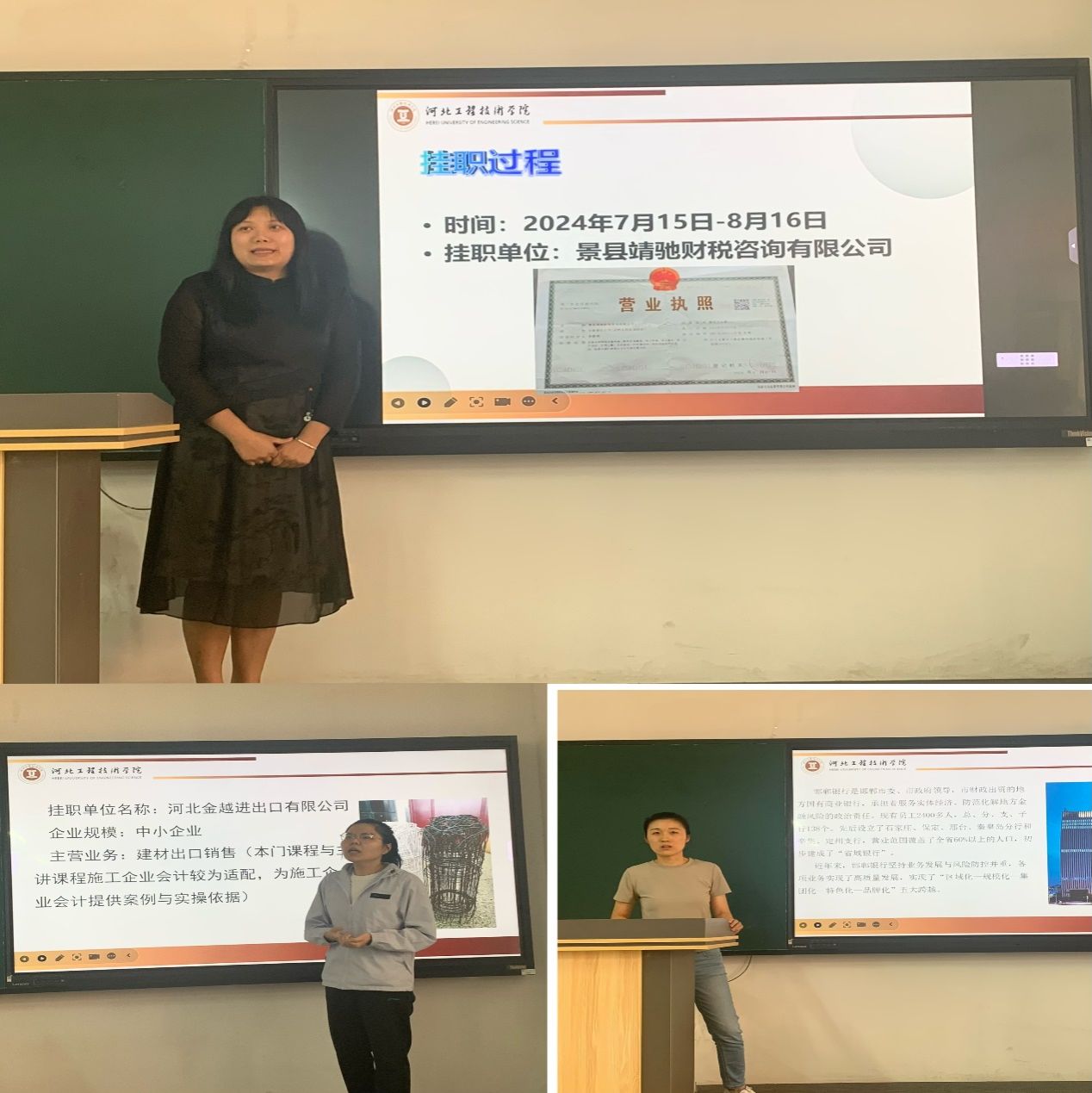 刘海燕、陈曦芃、李美娟、刘烨昭、万月、张泽帅六位老师做了赴企业挂职锻炼汇报。刘海燕老师结合自己担任财税顾问的挂职经历,提出教师接触真实企业财务等资料,有利于提高教师专业技能及实践能力,丰富课堂案例,更好的提升教学效果。陈曦芃老师提出通过与企业一线财务人员交流,找出解决方法,为完善课程内容提供有效的依据。万月老师提出企业实账和课堂教学有巨大的区别,从审核、记账到报表、报税,无论是纸质化、电算化还是智能财务,课堂与实际还有差别,也为此后课堂教学积累了实战经验。刘烨昭老师提到通过挂职锻炼更新行业信息,很好的提升自己的教学能力。李美娟与张泽帅老师分享自己的挂职看法,都提到挂职锻炼在帮助自己将理论知识得以更好应用,进而丰富课程内容,提高自己解决问题的能力。