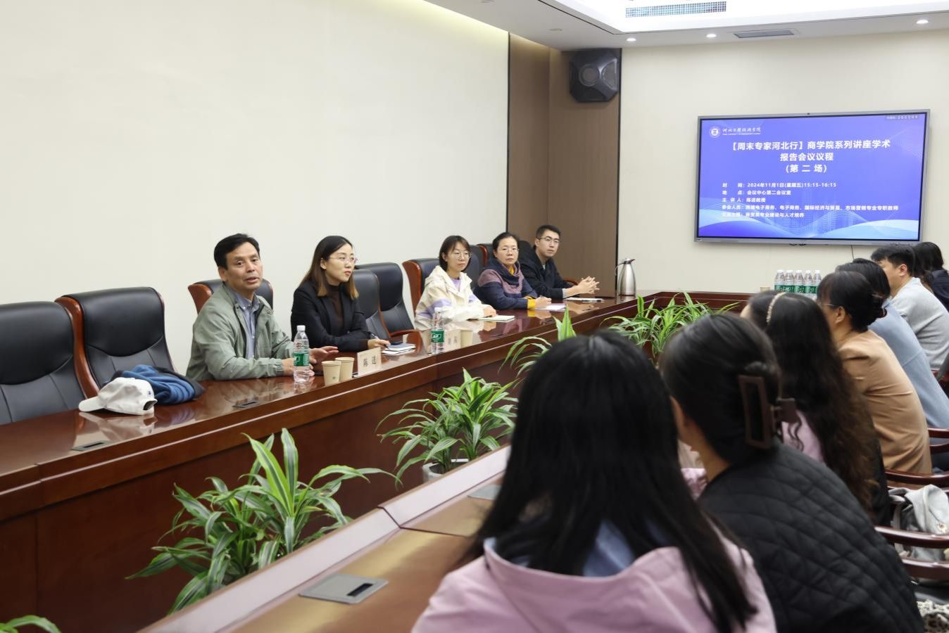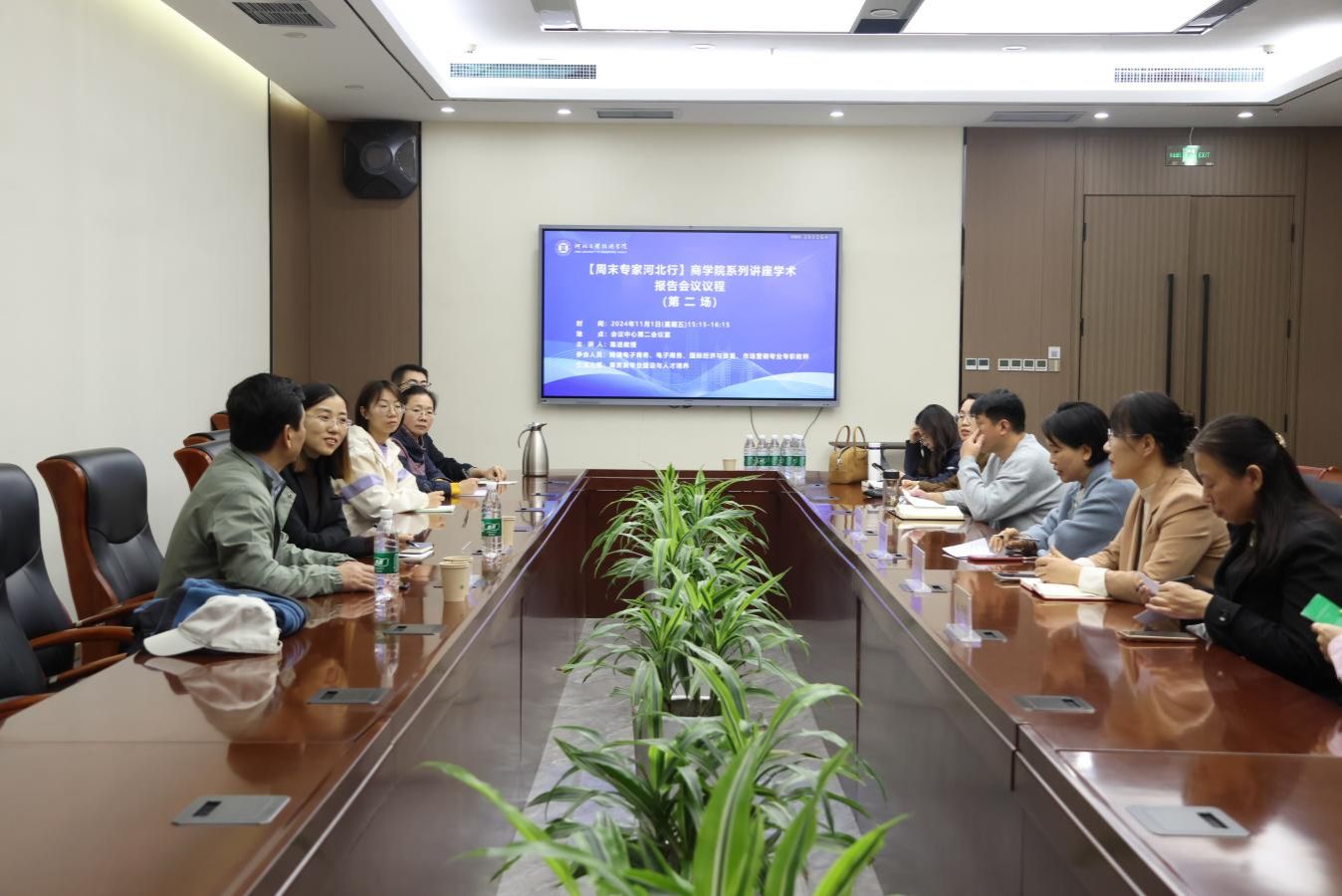 2024年11月1日(星期五) 【周末专家河北行】beat365官方网站系列讲座学术报告会议在会议中心第二会议室举行。会议由beat365官方网站刘茜院长主持。教育部高等学校电子商务类专业教指委副主任,博士生导师,陈进教授参加了商贸类专业建设与人才培养的研讨。跨境电商、国际贸易、电子商务、市场营销系教师参加了本次研讨会。