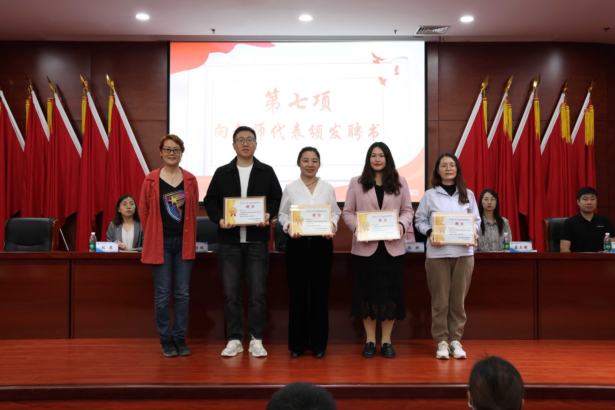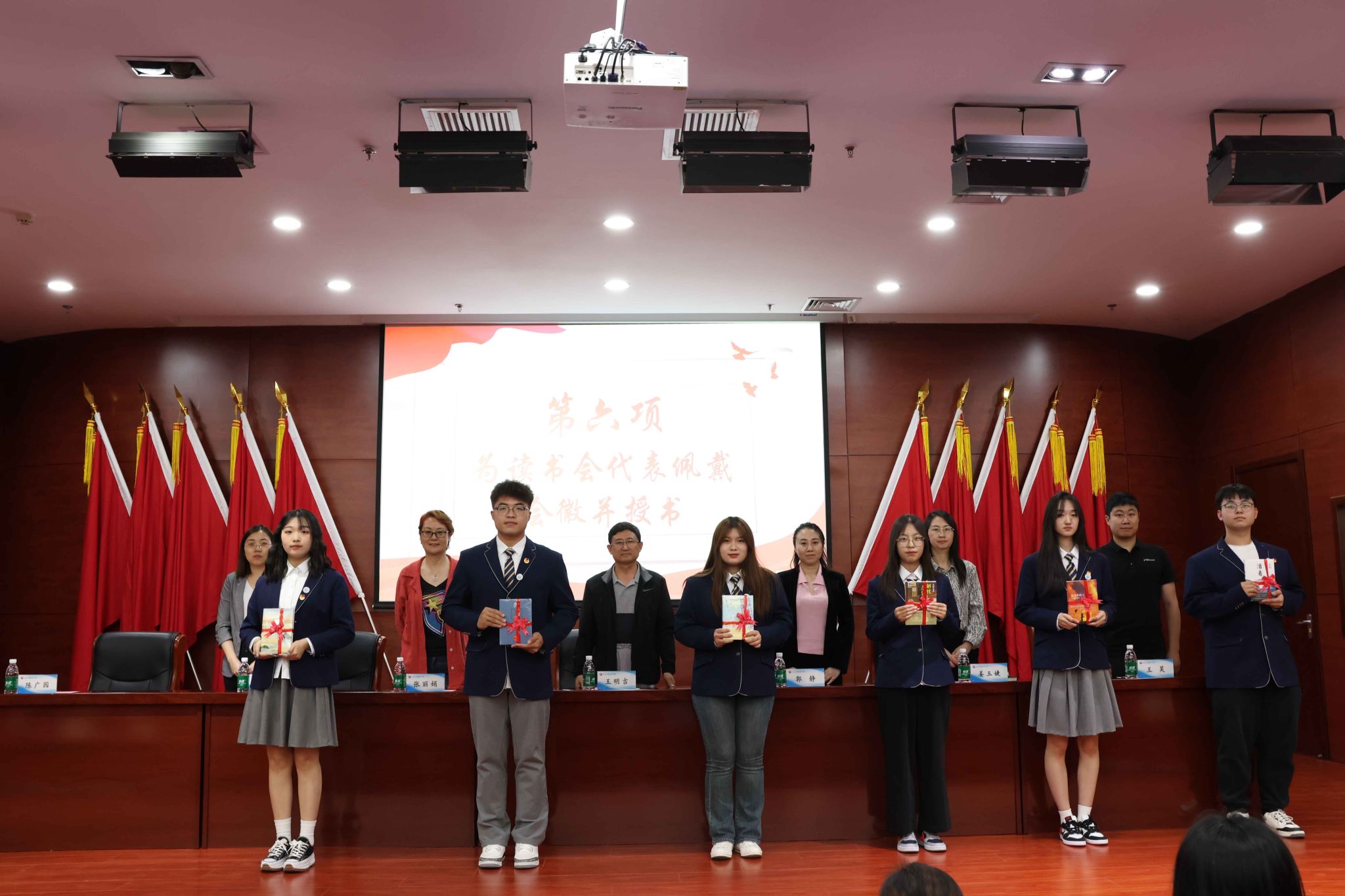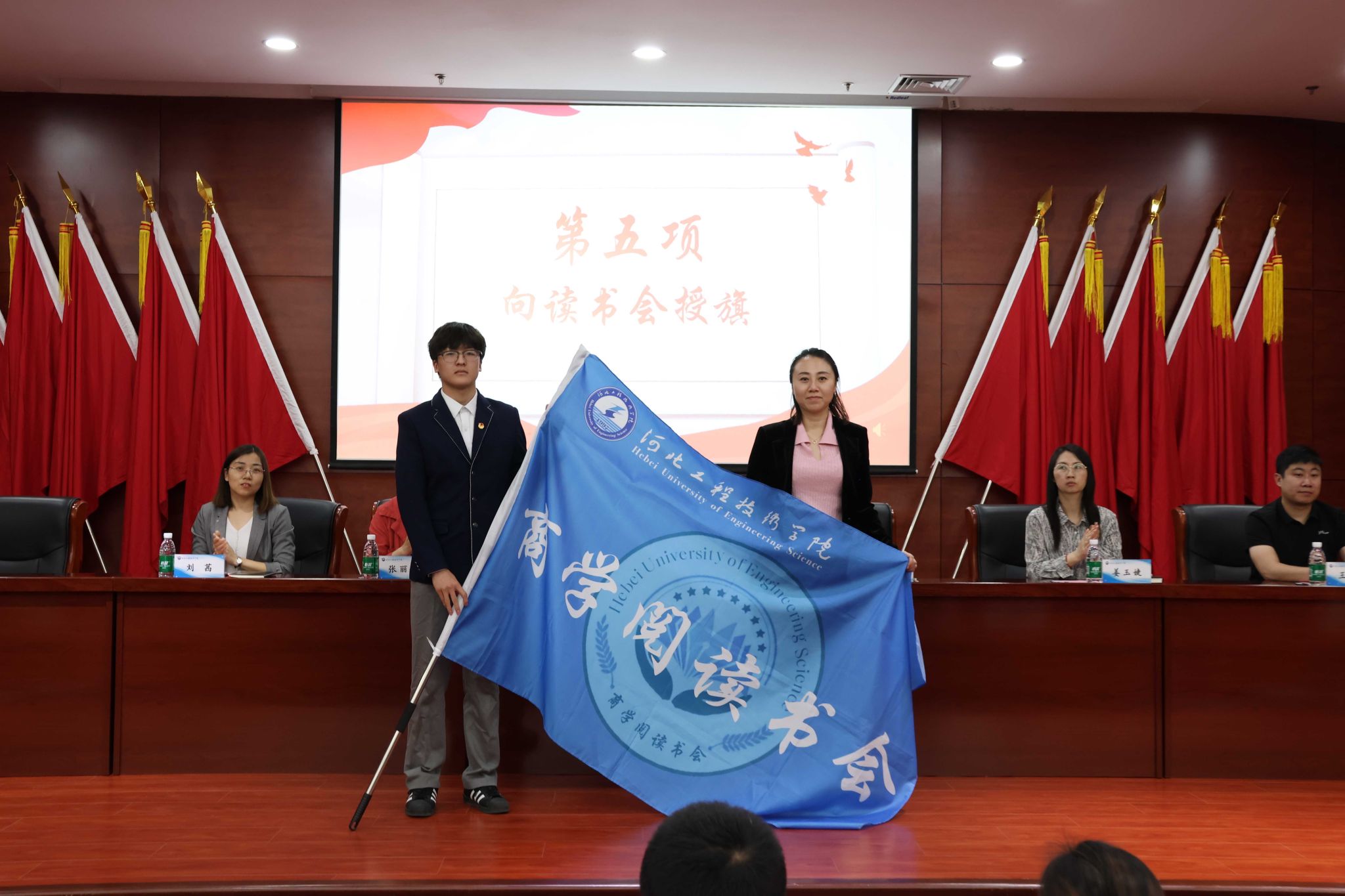 在授旗授书环节,学生工作处处长、校团委书记郭静向读书会授旗,全体领导为读书会代表佩戴会徽并授书图书馆馆长张丽娟向读书会指导教师颁发聘书。