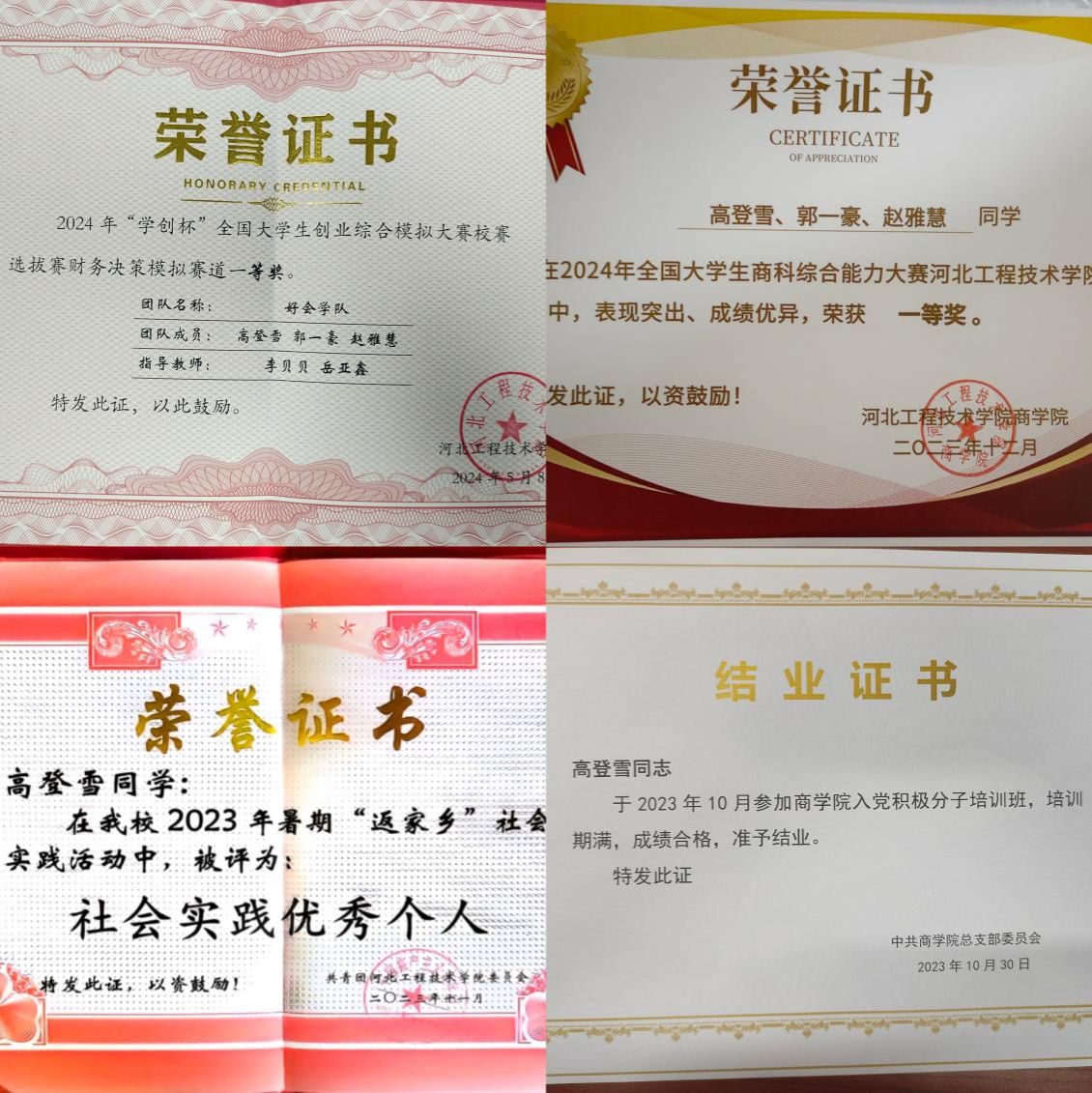 她学习态度端正,重视专业知识的学习,大一学年综测排名名列前茅,荣获校级“优秀学生干部”荣誉称号。积极参加各种专业竞赛,大学生创新创业项目,并取得商科综合能力大赛校级一等奖、第十四届学创杯校级一等奖等奖项。同时能够充分合理地利用时间,提高学习效率,在课余时间积极阅读书籍,提高修养,陶冶情操。