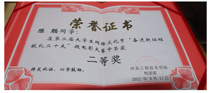 2022年8月11日在第二届大学生网络文化节微电影大赛荣获“二等奖”