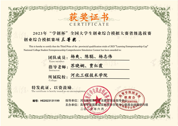 2023年6月 荣获2023年“学创杯”全国大学生创业综合模拟大赛省级选拔赛“省级三等奖”