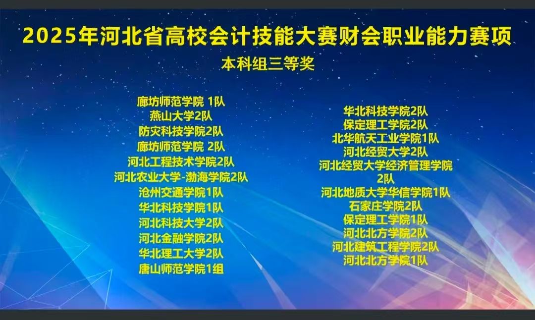 2025 年 10 月 18 日,由河北省教育厅举办的河北省会计技能大赛财务会计职业能力赛项在石家庄圆满落幕。beat365官网精心选拔的参赛团队凭借扎实的专业功底、默契的团队协作与高效的实战能力,最终荣获本科组三等奖一项,充分展现了beat365官网专业人才培养的过硬质量与学子们的专业风采。