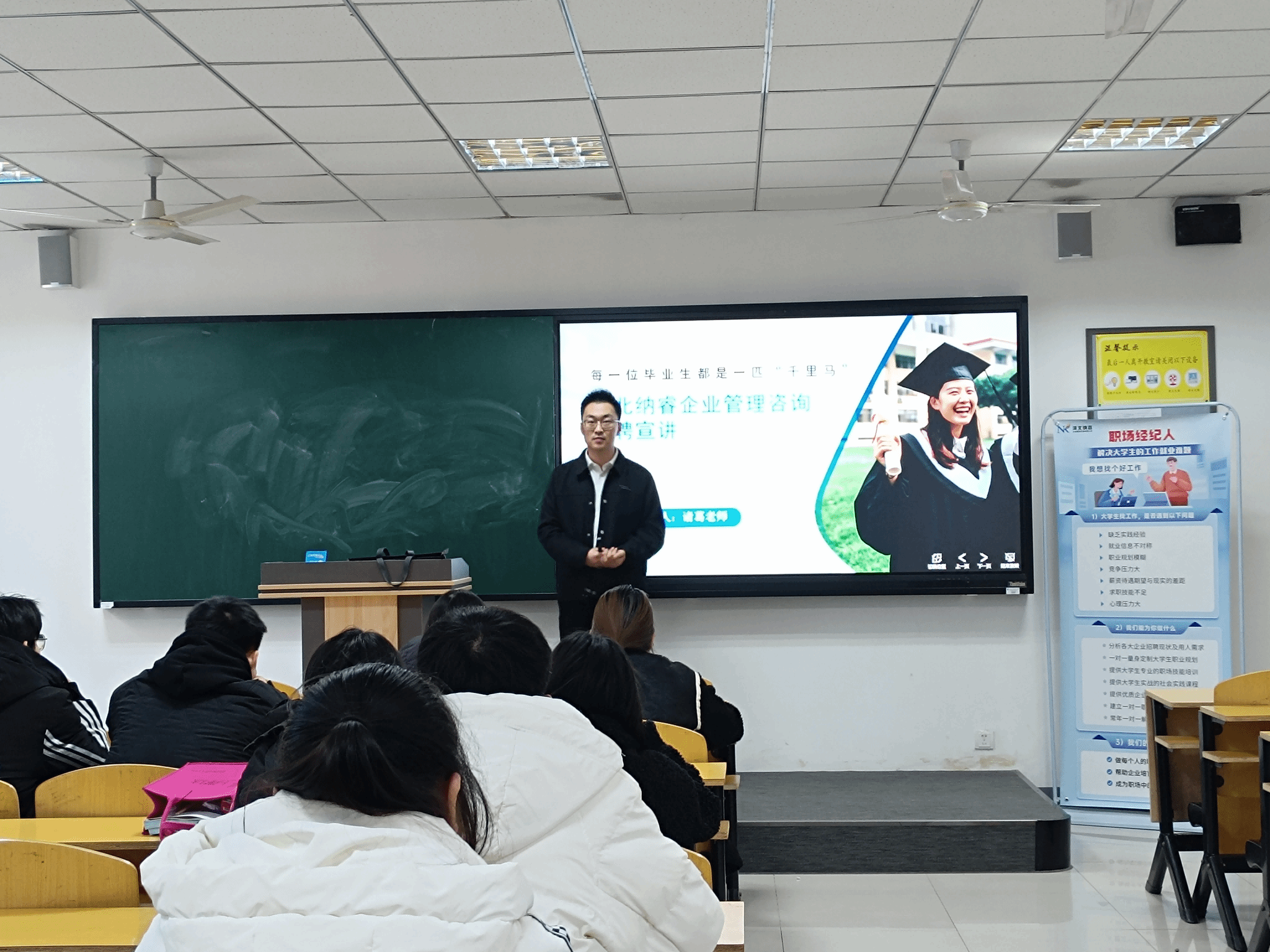 宣讲会开场,由河北纳睿公司的资深业务主管作为主讲人,登台便以一个鲜活的职场案例吸引全场目光。故事主角凭借出色的“职场经纪人”能力,帮助企业高效匹配人才、优化人力架构,实现业绩飞跃,生动诠释了这一岗位的价值与魅力。主管详细解读公司时提到,作为行业内的佼佼者,纳睿凭借专业的咨询团队和前沿的服务理念,在企业管理咨询领域闯出一片天地,业务覆盖京津冀,合作企业横跨多行业。