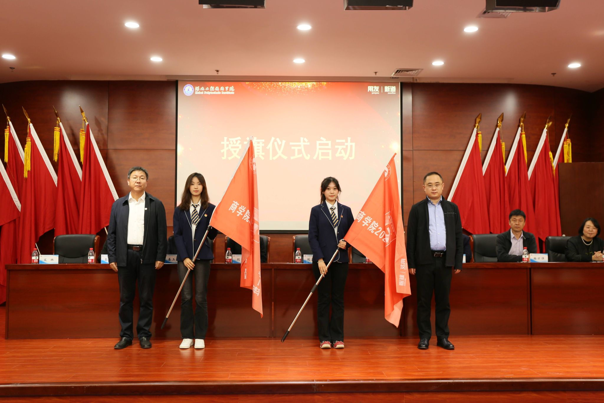 典礼上,beat365官方网站校长助理刘喜贵、新道科技股份有限公司助理总裁许鹏共同为数智财经产业学院2023级新道班进行授旗;beat365官方网站李颖同学代表数智财经产业学院2023级新生发表讲话。