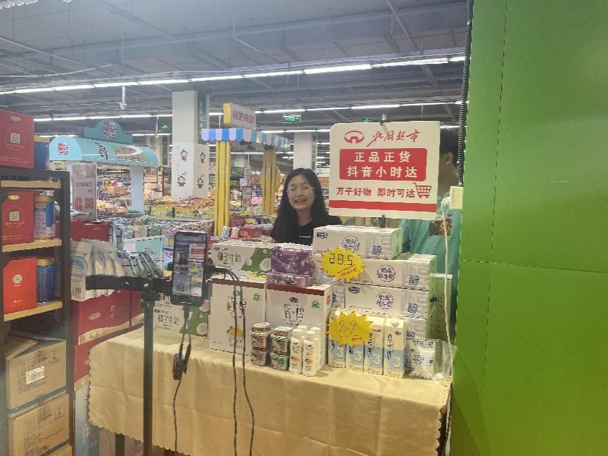 随后学生们分组前往北国超市(天河店)、益东北国购物中心开展现场直播练习。从下午两点到五点半的直播时间里,学生们充分发挥所学,运用话术进行产品介绍和推广,吸引了众多观众的关注和参与。他们的精彩表现不仅赢得了观众的喜爱,更创造了半天GMV达到5000元的业绩。