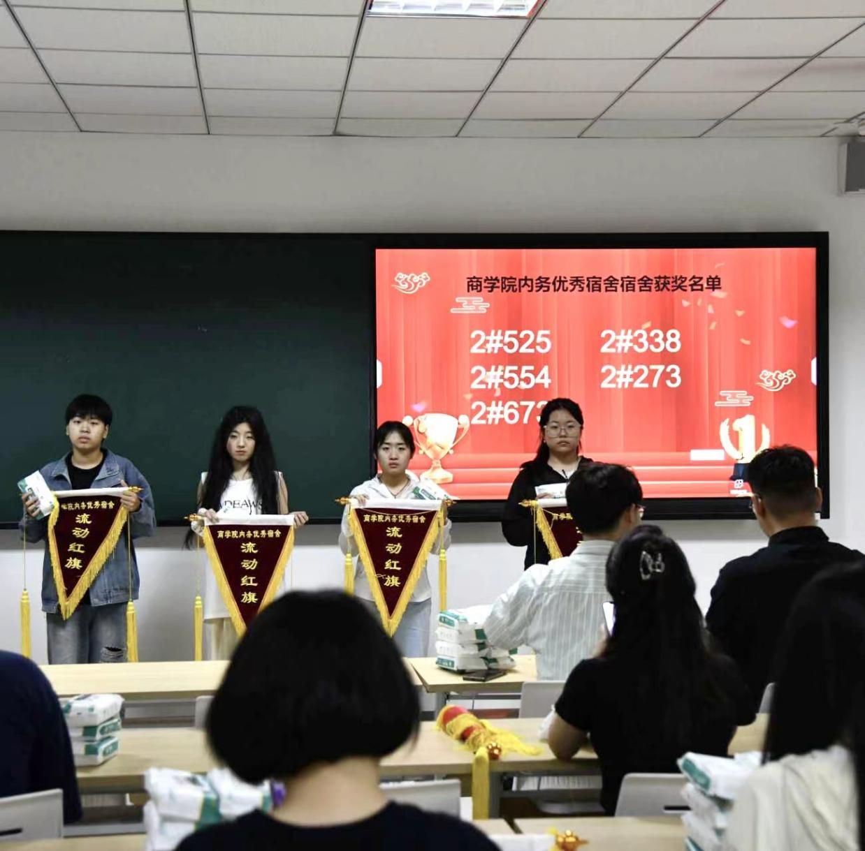 beat365官方网站自律委工作人员、安全文明宿舍代表和内务优秀宿舍代表参加颁奖仪式。通过4月综合评比,共有6间宿舍获得“安全文明宿舍”和10间宿舍获得“内务优秀宿舍”荣誉称号。工作人员对以上优秀宿舍颁发流动红旗及奖品以资鼓励,并组织了以上优秀宿舍代表进行拍照留念。
