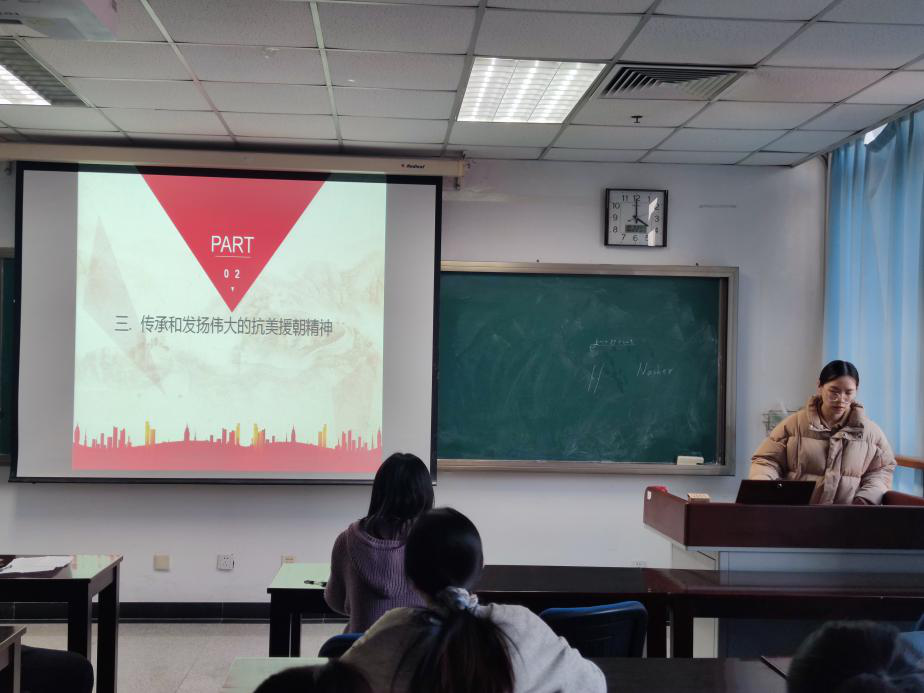 其次应用统计硕士党支部书记宋琳琳用6个数字为大家介绍了习近平总书记在纪念中国人民志愿军抗美援朝出国作战70周年大会上的重要讲话的内容,这6个数字分别是:3个“始终没有忘记”,5个“经此一战”,4个“无论时代如何发展”,5个“铭记”,3个“根本行不通”,2个“绝不会”,除此之外,宋琳琳还为大家介绍了抗美援朝战争伟大胜利的深远意义以及抗美援朝精神的内涵。在中美关系如此紧张的背景下,习近平总书记的讲话表明了我们敢于斗争、敢于胜利的决心,同学们都觉得这篇讲话说得硬气、听得提气。雄赳赳,气昂昂,让我们朝着中华民族伟大复兴的光明前景奋勇前进。