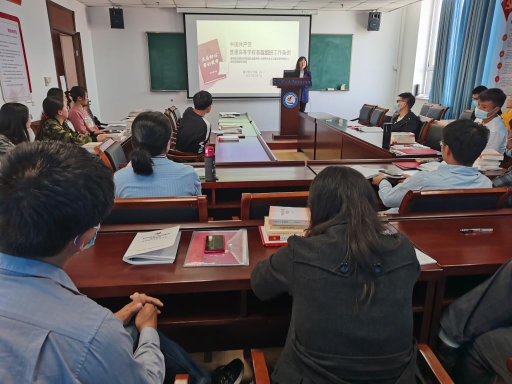 高兰以党课形式解读了《中国共产党普通高等学校基层组织工作条例》并传达了学校党委组织部《关于认真学习贯彻<中国共产党普通高等学校基层组织工作条例>的通知》文件精神,要求全体党支部书记及支部委员先学先行,以相关文件精神指导实践、推动工作、严格落实。随后对《习近平总书记在清华大学考察时重要讲话精神》做了重点传达,结合讲话中对教师提出要成为“大先生”、要研究真问题、要坚定信念,对学生提出要爱国爱民、锤炼品德、勇于创新、实学实干等内容,要求教师、学生党支部结合自身特点进行专门学习,同时传达了学校党委书记王寒松对贯彻落实习近平总书记重要讲话精神提出的相关要求。