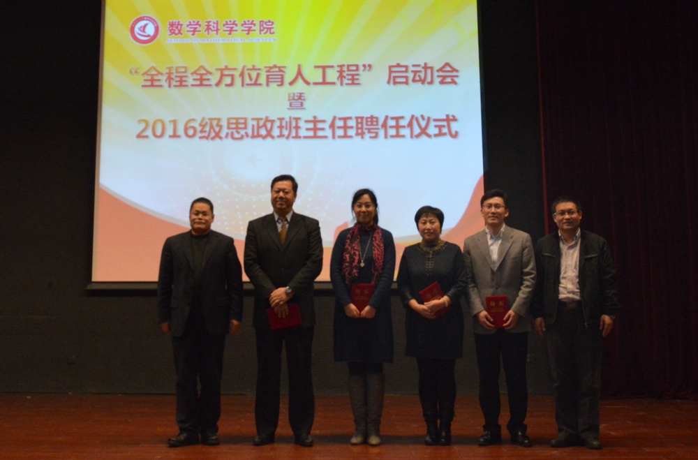 启动会上,学生工作处副处长顾丰宣读了永利集团3044欢迎光临2016级本科生思想政治教育班主任聘任名单。聘任校学生工作处李伟、校党委宣传部陈家晶、周福战、校团委陆凯、马克思主义学院梁大伟、离退休处王昕等六位老师分别担任数1601-1606班思想政治班主任。顾丰副处长和刘西民书记共同为思政班主任颁发聘书。这也是自2015级起,数学学院再次为每个新生班级配齐思政班主任。目前,学院思政班主任共有16位,占学院班级总数的67%。思想政治班主任与第一课堂教师、辅导员、专业班主任、本科生导师和家长等成为大学生日常思想政治教育的主要实施群体。日常思想政治教育与专业教育、家庭教育和第二课堂教育等共同成为学院全程全方位育人的重要一环。辅导员、专业班主任、思政班主任也成为了优良班风学风建设的教师“铁三角”。