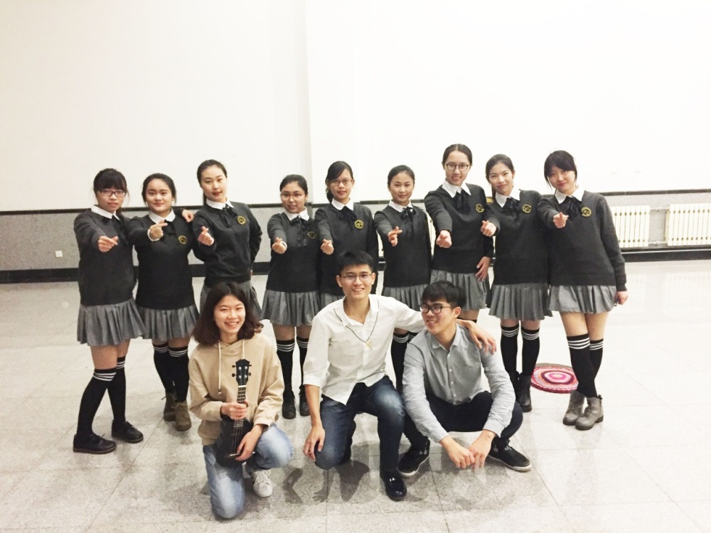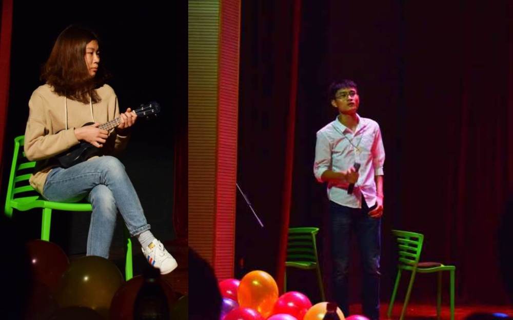 随后,队伍里又加入了一位拿着一把乌克丽丽的美丽学姐,和一位嗓音充满磁性的忧郁学长,他们分别是大三的李文学姐和蒋理学长。在表演过程中,他们分别用琴音和歌声为表演伴奏,让大家的整体表演大为增色。