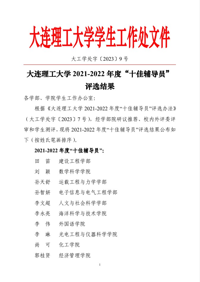 近日,经申报推荐、现场打擂、校内外专家评审和学生测评,最终学院辅导员刘颖老师荣获学校2021-2022年度“十佳辅导员”荣誉称号。这是我校有史以来首次评选“十佳辅导员”。
