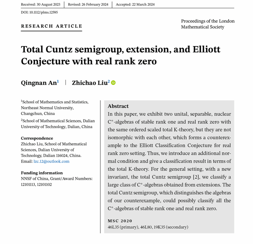 永利集团官网副教授刘智超与东北师范大学安庆楠在国际著名数学期刊《Proceedings of the London Mathematical Society》上发表了题为“Total Cuntz semigroup, extension, and Elliott Conjecture with real rank zero”的研究成果。 该期刊于1865年创刊,是伦敦数学会的旗舰期刊,论文涵盖广泛的数学领域,致力于发表领域内最高质量和重要意义的文章。