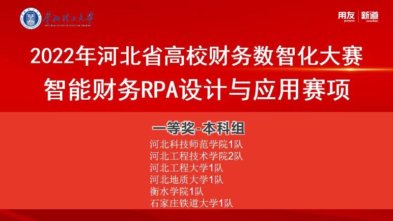 本次大赛由河北省教育厅主办,由华北理工大学、新道科技股份有限公司联合承办。智能财务RPA设计与应用赛项以“新道云”作为平台。充分结合财务会计类专业学生的认知和学习特点,将智能机器人设计与应用知识点全部案例化、任务化。以竞赛方式让学生在案例实操中,结合当下最新的“财务数字化”理念,通过“流程变革+应用设计”的考核方式,培养财会专业学生的流程优化思维与RPA设计与应用能力,以及借助智多星工具发现、分析与解决企业财务管理问题的能力,促进团队成员间的沟通协作能力,是学生展示财务智能化能力的舞台。