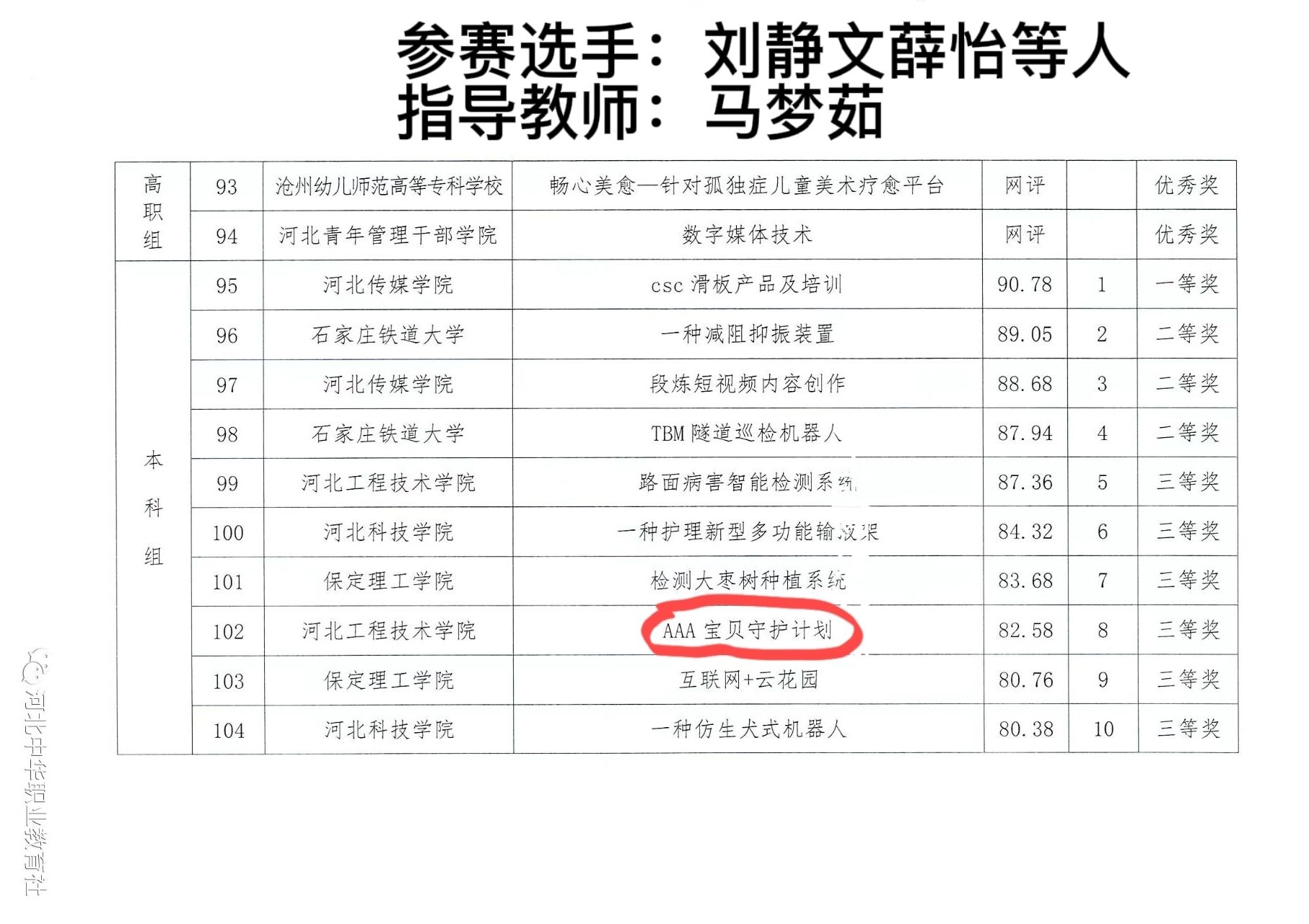 第三届河北省中华职业教育创新创业大赛,beat365官方网站作品《AAA宝贝守护计划》荣获三等奖。参赛学生:刘静文 杨雅茜  薛怡  薛玟  丁虹羽  宁聪颖  王昊冉   指导老师:马梦茹
