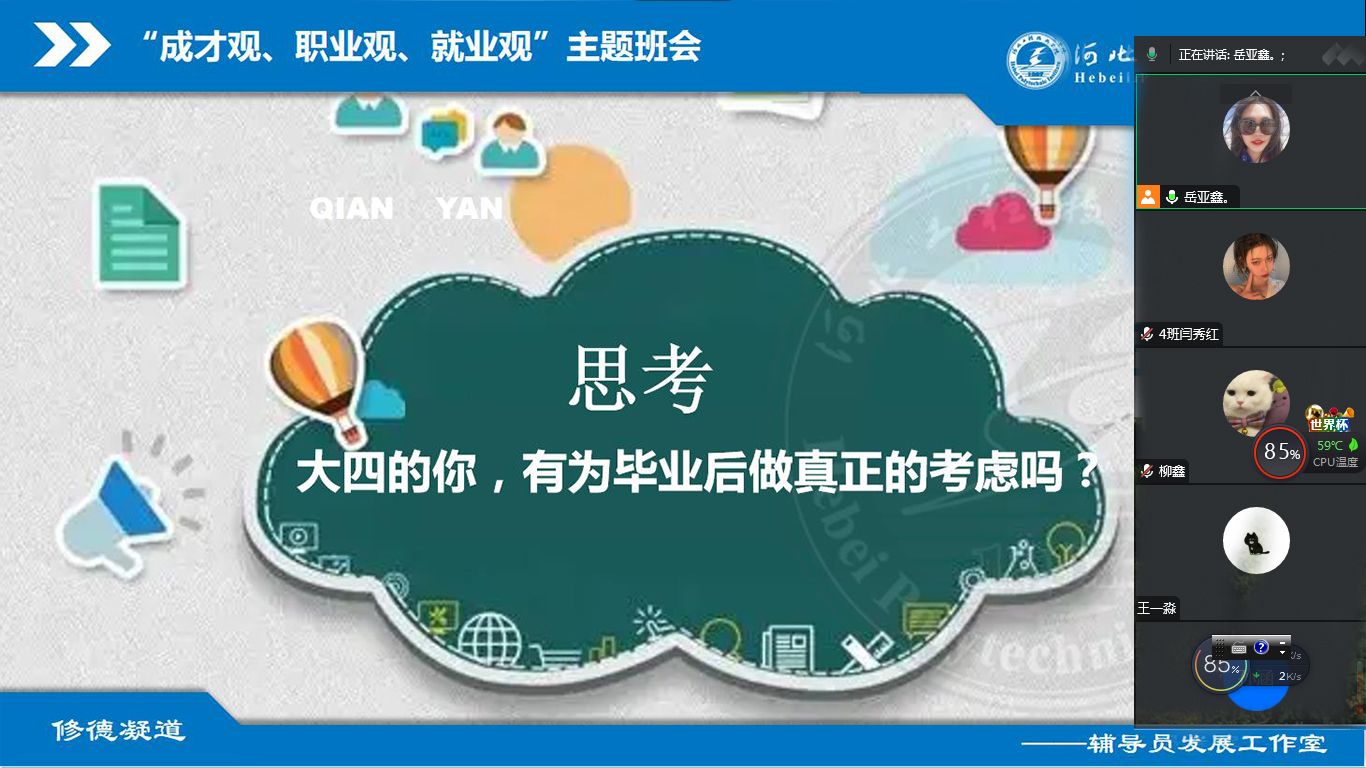 beat365官方网站各毕业班以线上形式召开了2023届毕业生就业动员“成才观、职业观、就业观”主题班会。帮助毕业生能够更好的认清就业形势,做好就业准备,把握就业机会,优质积极就业。