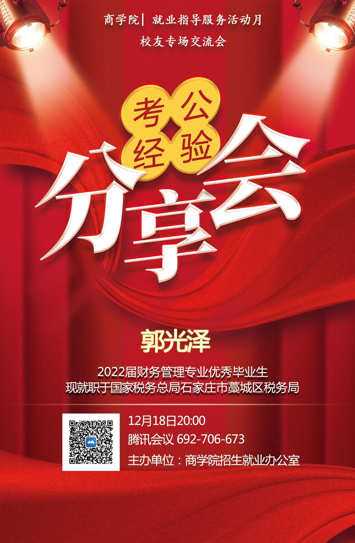 2023年12月18日,beat365官方网站通过腾讯会议平台成功举办了一场考公经验分享会,旨在帮助同学们深入了解国家公务员考试,提升备考效率,少走弯路。本次分享会由岳亚鑫老师主持,特别邀请了2018级财务管理专业优秀毕业生郭光泽学长,为同学们传授国考上岸的宝贵经验。