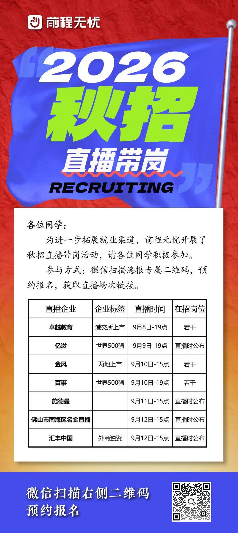 秋招季已经到来,为助力大家顺利开启职业生涯,前程无忧特别推出“秋招直播带岗”活动!本次活动汇聚了卓越教育、亿滋、金风、百事、施德曼、汇丰中国等多领域知名企业,涵盖教育、快消、新能源、金融等多个行业,更有世界500强、上市公司等优质雇主直招。只需微信扫描海报二维码,即可预约报名、获取直播场次链接,实时了解岗位信息、与HR在线互动。机会有限,行动趁现在!愿每一位同学都能抓住秋招机遇,收获心仪offer,迈向更广阔的未来!