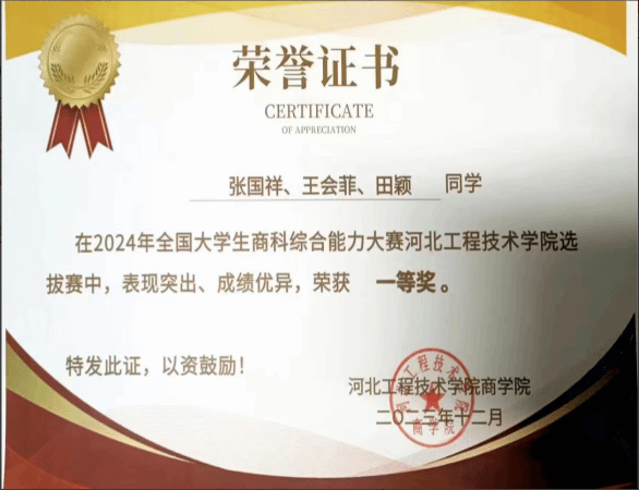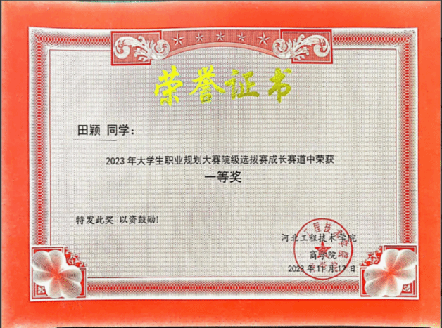 对于她来说学习是一件快乐的事情。学习方面严格要求自己,凭着对个人目标和知识的强烈追求,刻苦钻研,勤奋好学,态度端正,目标明确,牢固的掌握了一些专业知识和技能,同时把所学的理论知识应用于实践活动中,把所学知识转化为动手能力、应用能力和创造能力,力求理论和实践的统一。曾获2022-2023国家奖学金、职业规划大赛院赛一等奖、2023第三届全国大学生心理知识大赛一等奖、“学习二十大精神网络知识竞赛”二等奖、beat365官方网站“集市中的年味”活动一等奖等。