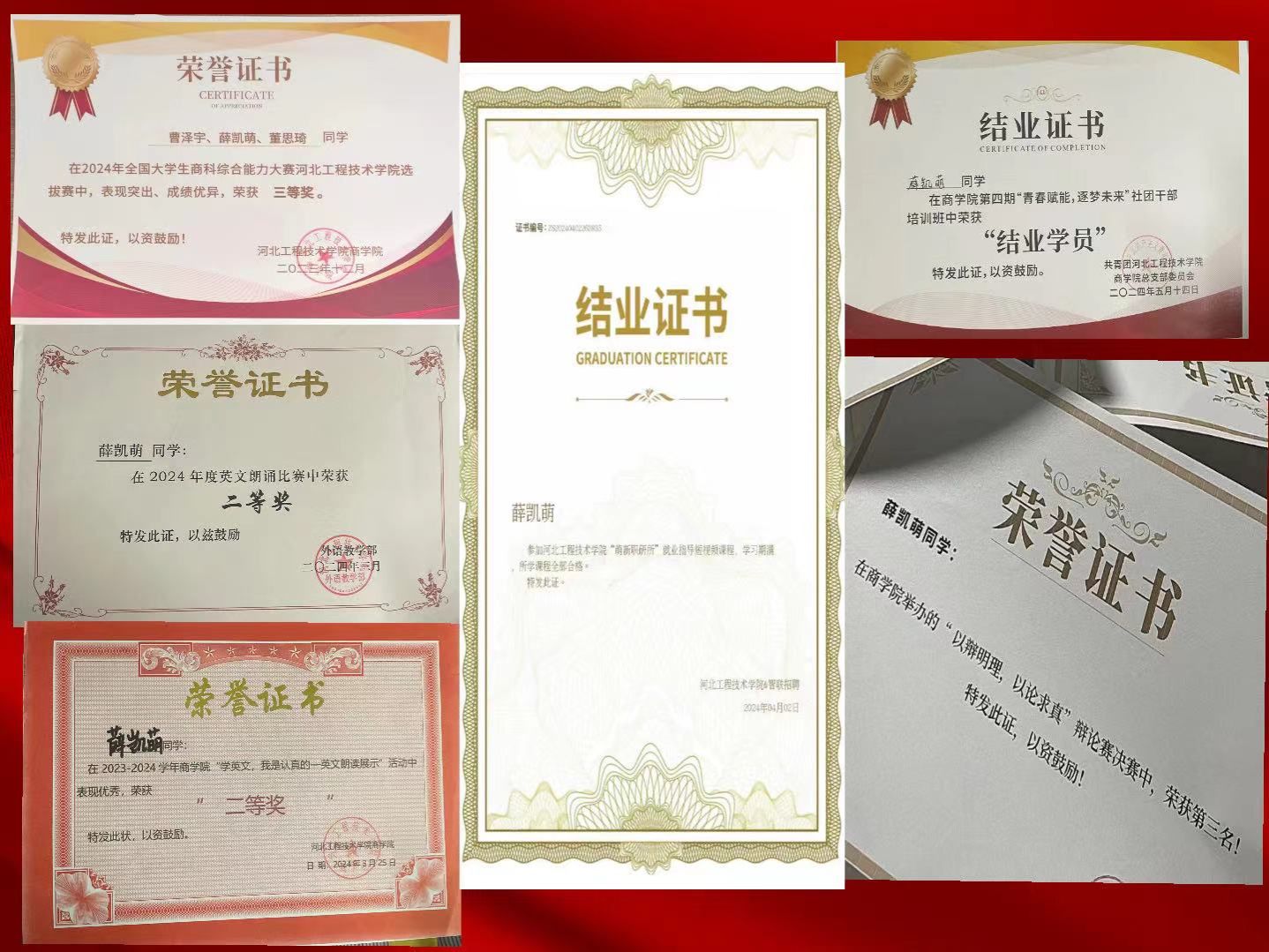 薛凯萌在大学学习中积极参与各种社会实践,如崖山国学社“国韵流长”戏曲课堂、“园艺心连心”活动、校联社realme时尚社团女神节舞会活动、“浓浓乡情,特色家乡”主题摄影活动、“让创意随落叶飘”活动、“心有千千结”活动等等,提高了自己的综合素质,并取得了显著成绩。