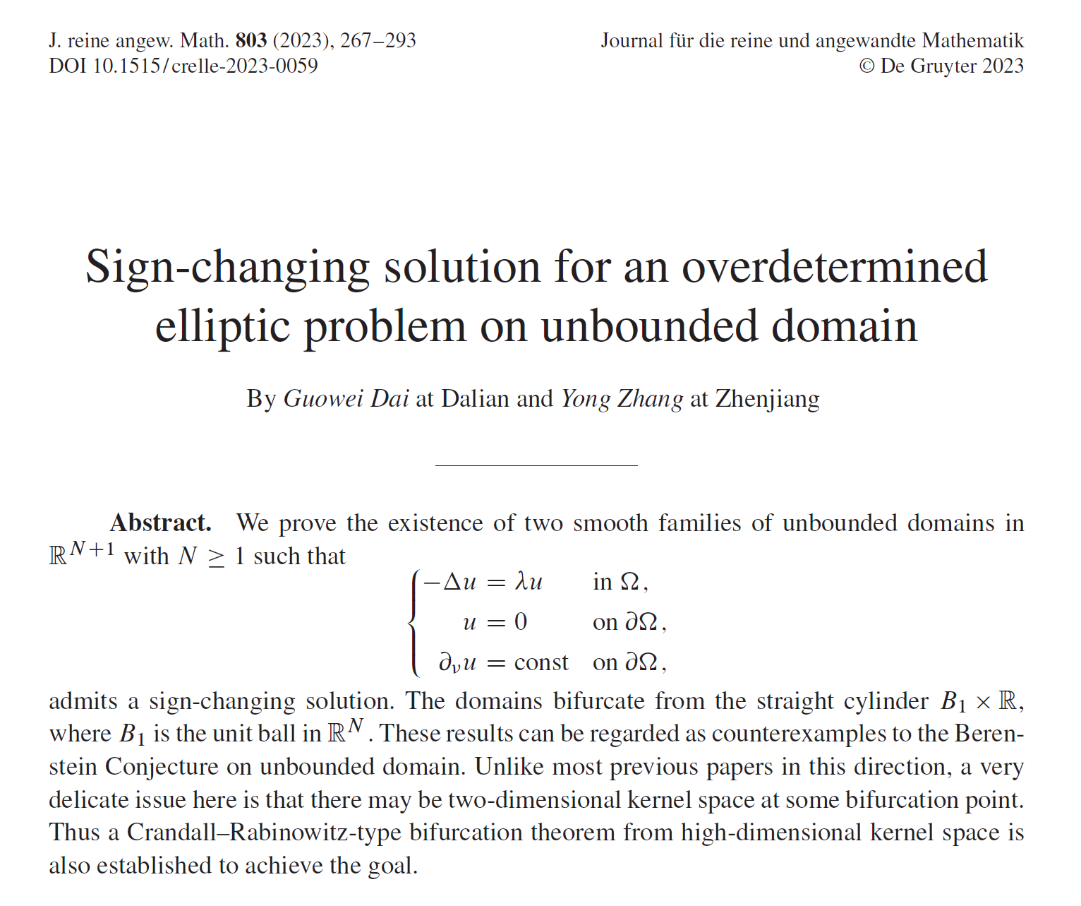 永利集团官网教授代国伟与永利集团官网博士毕业生张勇在世界著名期刊 Journal für die reine und angewandte Mathematik (Crelle's Journal) 上发表了题为“Sign-changing solution for an overdetermined elliptic problem on unbounded domain”的研究成果。该杂志是世界上现存最古老的数学期刊,自1826年创刊以来,至今已有近200年的历史。