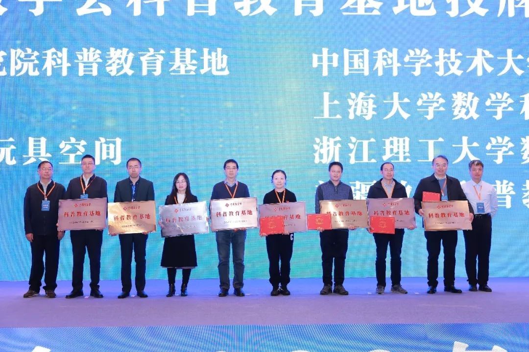 田刚理事长宣布了入选中国数学会科普教育基地的8个单位名单:中国科学院数学与系统科学研究院科普教育基地、西南联大数学文化馆、厦门大学图书馆数学与智力玩具空间、UIC数学体验馆、中国科学技术大学数学与应用科普教育基地、上海大学数学科普教育基地、浙江理工大学数学科普教育基地、新疆数学科普教育基地。史宇光副理事长和周爱辉副理事长为8家单位代表授牌。