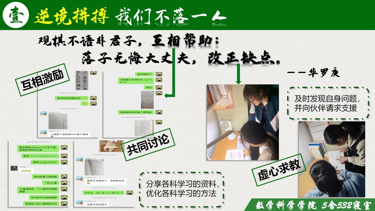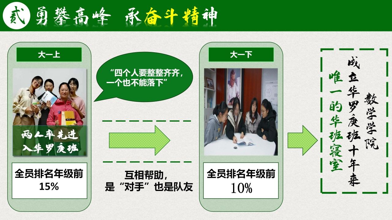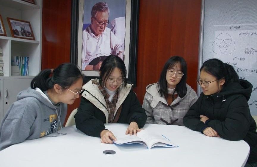她们共同努力,力求进步,在合作中竞争,促成了全体的共同进步。大一秋季学期结束,她们成绩均排年级前15%,两人选拔进入华罗庚班;大一学年结束,经过相互帮助,自我超越,寝室4人均进入华罗庚班,成为了学院自成立华罗庚班10周年来唯一的华班寝室。