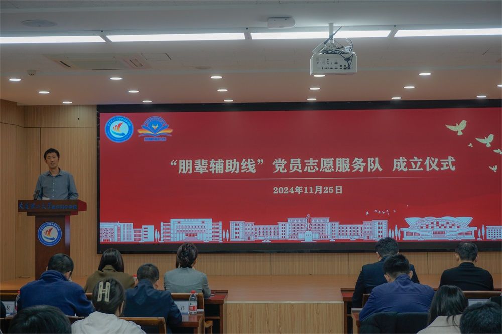 为进一步助力学校拔尖创新人才培养,提高全校本科生数学公共基础课的学习质量,帮助更多低年级本科生筑牢数学基础, 学院党委主动谋划、积极动员,以研究生党员为参与主体,成立了“朋辈辅助线”党员志愿服务队。11月25日下午,学院召开了志愿服务队的成立仪式。学院党委书记崔强、副院长刘永朝、党委副书记兼副院长巴雪冰、学校主校区各书院副院长、以及学院“朋辈辅助线”党员志愿服务队的指导老师与志愿者参加了成立仪式。本次仪式由学院学生工作办公室主任刘颖主持。