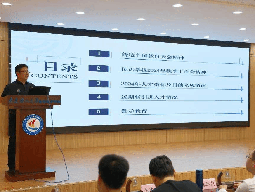 最后,党委书记崔强传达了全国教育大会精神及学校秋季工作会精神,梳理了学院上半年人才工作取得的成效,强调了人才工作在学院事业发展中的重要性。崔强指出:要处理好目标与指标的关系,锚定目标不放松;要处理好整体与局部的关系,心系大局谋发展;要处理好守正与创新的关系,改革创新求突破;要处理好主动与被动的关系,谋定快动成优势。随后,崔强为全体教工开展党纪教育,通过解读案例的方式警示教职员工要筑牢思想防线、保持清正廉洁。