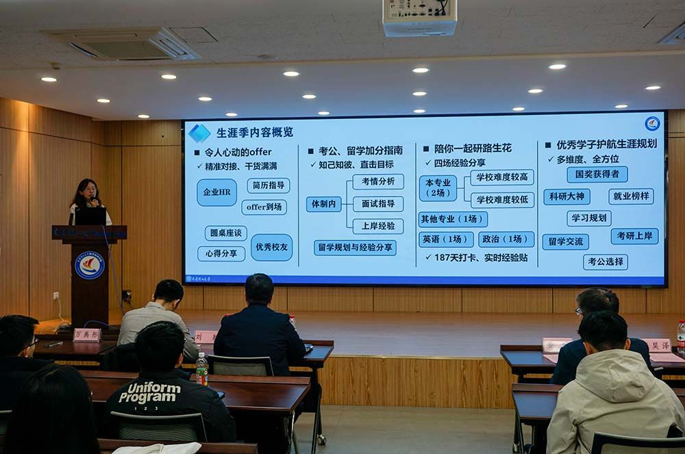 万禹彤老师系统介绍了学院“π动领航——生涯赋能季”系列活动安排,包括企业求职、考公留学、考研保研和生涯规划护航的四大板块,强调以“赋能”为核心,通过各板块下校友引领、名企对接、考研保研指导、187天打卡等多元路径,全方位、多维度助力数学学子锚定方向、砥砺前行。