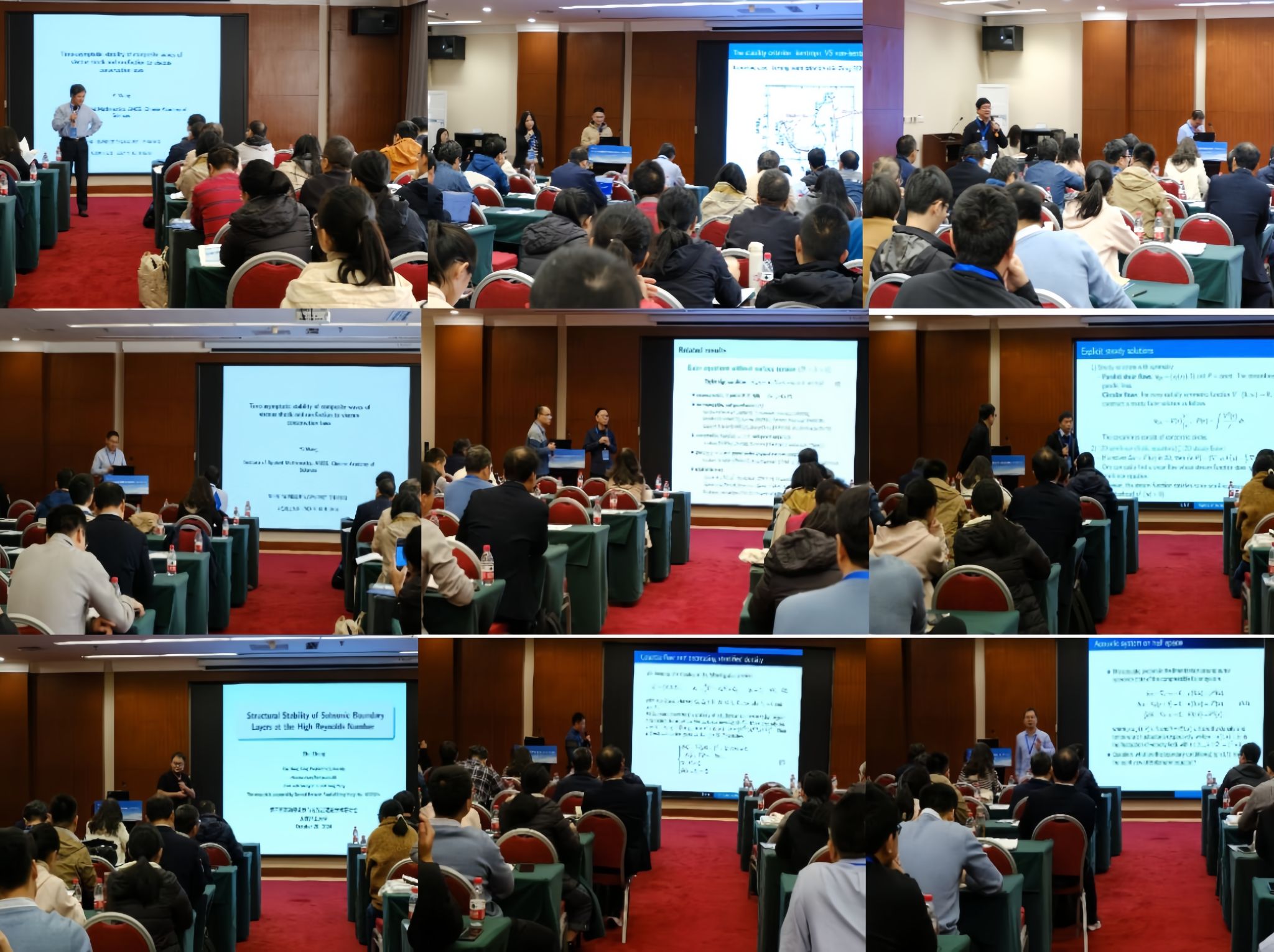 本次研讨会汇聚了来自香港中文大学、北京大学、中国科学院数学与系统科学研究院、中国科学技术大学、上海交通大学等40余所知名高校的100余名偏微分方程领域专家学者。会上,中国科学院数学与系统科学研究院王益教授、四川大学王渝西教授、湘潭大学王钰聪教授、中国科学技术大学高宸博士、武汉大学王涛教授、北京大学邵锋博士、深圳大学张擎天教授、上海交通大学谢春景教授、香港理工大学张筑教授、武汉大学江宁教授、华中师范大学訾瑞昭教授等多位学者做了精彩的学术报告。与会者围绕高雷诺数下流体力学方程组基本流的稳定性与失稳问题、边界层理论及自由界面问题等前沿问题展开了深入交流与探讨,提出了诸多富有价值的见解与建议,现场学术氛围浓厚。