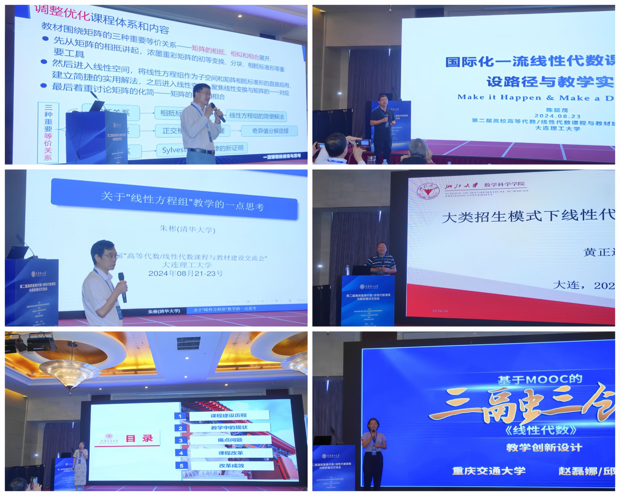 在大会报告阶段,厦门大学林亚南教授,天津大学孙笑涛教授,电子科技大学黄廷祝教授,合肥工业大学朱士信教授,华东师范大学谈胜利教授,中国科学技术大学陈发来教授,南京大学丁南庆教授,东南大学陈建龙教授,北京大学冯荣权教授,上海大学王卿文教授,清华大学朱彬教授,南方科技大学陈懿茂教授,浙江大学黄正达教授,上海交通大学蒋启芬教授,重庆交通大学邱焕焕老师分别作了《AI背景下的高代线代课程建设的一些思考》《线性代数课程设计与实践》《新时代创新人才培养的线性代数课程教学的一些思考与实践》《AI时代大学数学课程建设的探索与实践》《将数学史融入到高等代数教学的几个案例》《代数张量》《南京大学高等代数课程与教材建设》《线性代数一流课程建设与教学创新实践》《数学“101计划"<代数学>教材建设的思考》《教育数学指导下的一流课程教材建设--以线性代数为例》《关于线性方程组教学的一点思考》《国际化一流线性代数课程的建设路径与教学实践》《高等代数/线性代数课程思政的探索与实践》《大类招生模式下线性代数教材建设的尝试》《上海交通大学线性代数课程教学改革》《基于MOOC的"三融三创"线性代数教学创新设计》的报告,与会老师讨论积极,反响热烈。