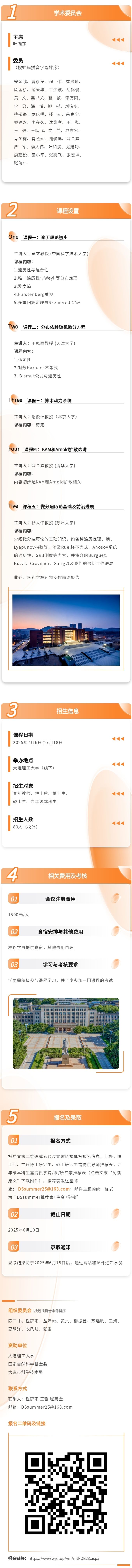 暑期学校简介:微分方程与动力系统是当今数学领域发展极为迅速的主流研究方向之一。为了进一步激发国内外青年学者对微分方程与动力系统的研究兴趣,提升其研究水平,并加强对青年学者的培养,永利集团3044欢迎光临将于2025年7月6日至7月18日举办第一届“微分方程与动力系统”暑期学校。本次暑期学校将为从事微分方程与动力系统研究的优秀本科生和研究生搭建一个集中学习与交流的优质平台,助力青年学者夯实理论基础,拓展学术视野,为其未来在相关领域的科研工作筑牢根基。