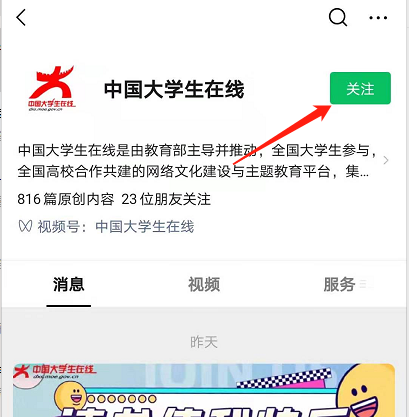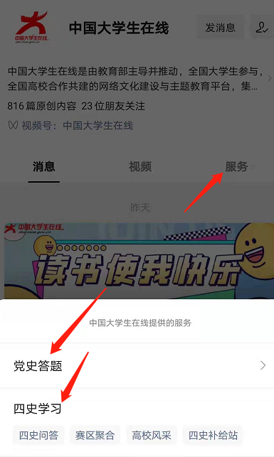关注“中国大学生在线”微信公众号,点击菜单栏“服务”,即可跳转至“党史答题”和“四史学习”界面(如下图)